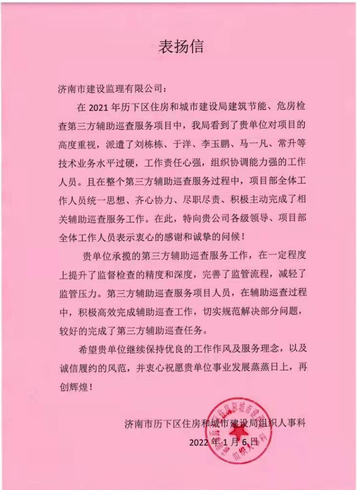 點(diǎn)贊!公司第三方輔助巡查服務(wù)團(tuán)隊(duì)獲歷下區(qū)住房和城市建設(shè)局組織人事科來信表揚(yáng)